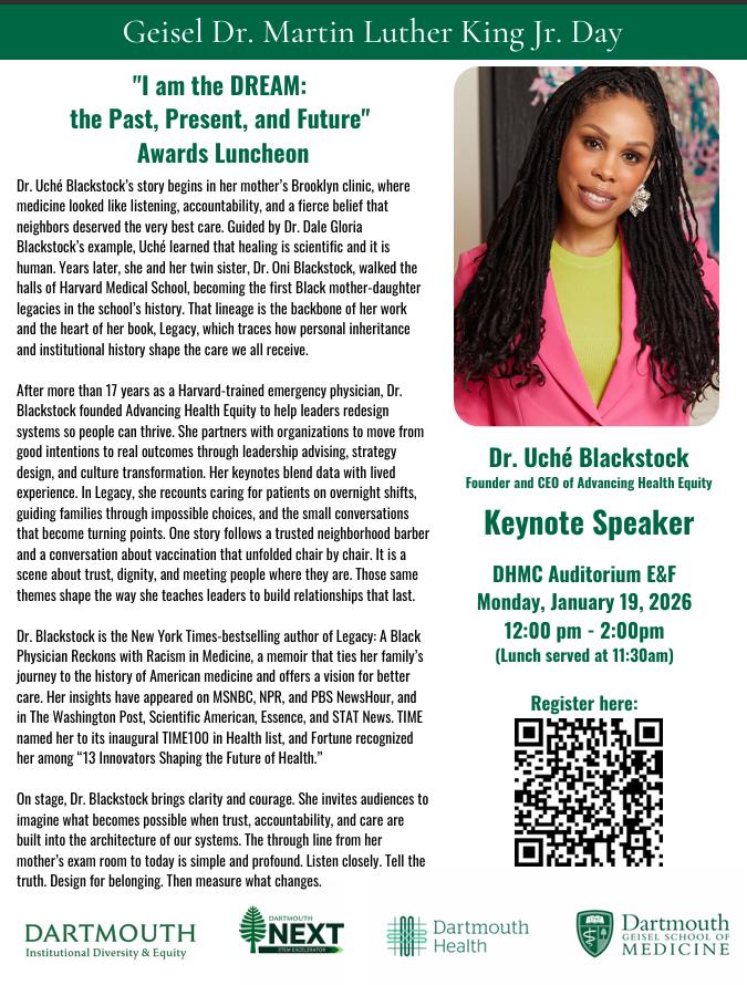 On Monday, January 19, 2026, the Geisel School of Medicine at Dartmouth will host its annual Dr. Martin Luther King Jr. Day Awards Luncheon, centered on the theme “I Am the DREAM: The Past, Present, and Future.”